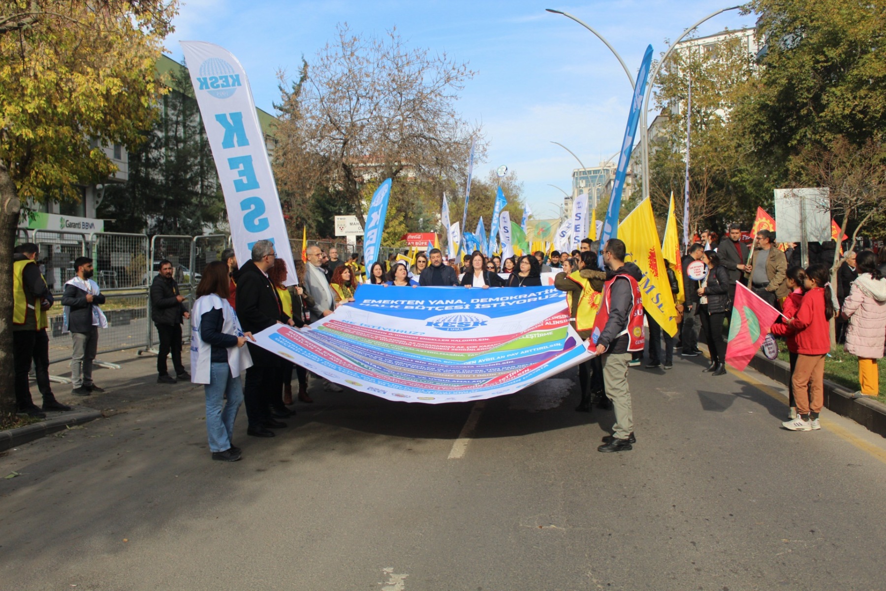DİYARBAKIR – Kamu Emekçileri Sendikaları Konfederasyonu’nun (KESK), Diyarbakır İstasyon Meydanı’nda “Emekten yana demokratik halk bütçesi istiyoruz” sloganı ile düzenlediği bölge mitinginde asılan pankartlar dikkat çekti.